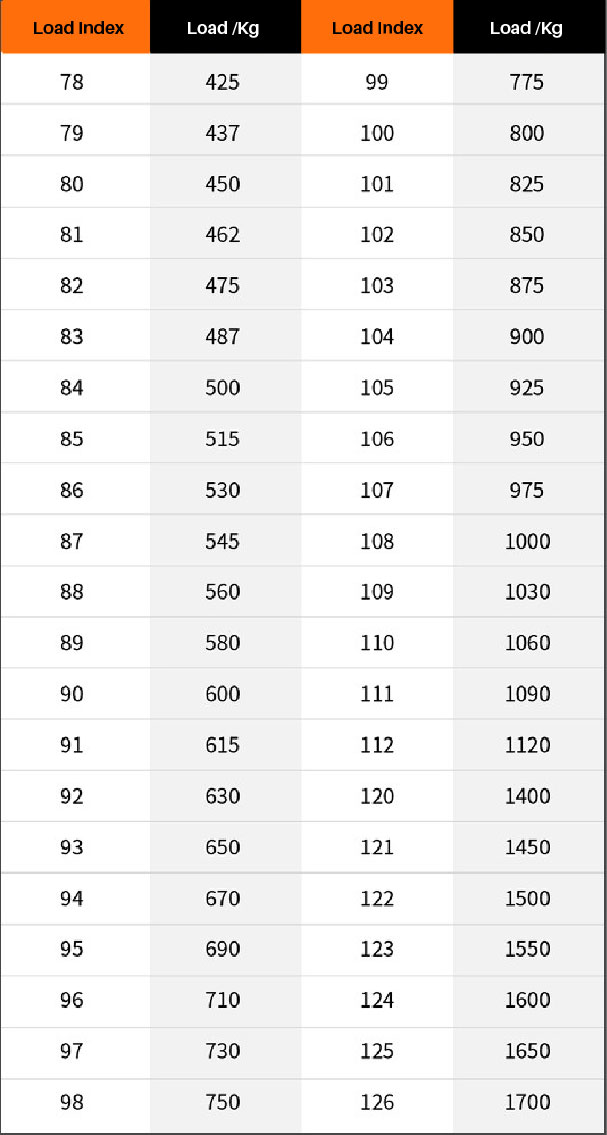 “91” is the tyre’s load index (LI). In the present example, this means that a tyre can be loaded with a maximum of 615 kilograms. If the load exceeds this value, there will be safety hazards. Here is a standard conversion table for converting this numerical code to the maximum tyre load. (See below)